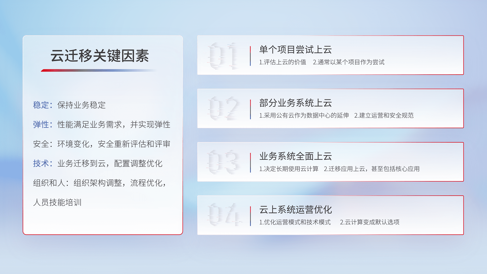结合实际业务,,,从规划设计、、、、云平台选型、、云原生改造、、、、数据迁移、、、集成交付,,迁移全过程为客户识别最佳上云路径,,,做好风险识别管理,,设计网络架构、、身份权限、、安全审计合规、、、、操作审计、、、日志审计、、监控告警策略、、多站点容灾设计等,,,对云上基础设施进行整体规划,,,,提升IT治理水平,,,,以满足弹性、、高可用、、、、高性能的需求。。