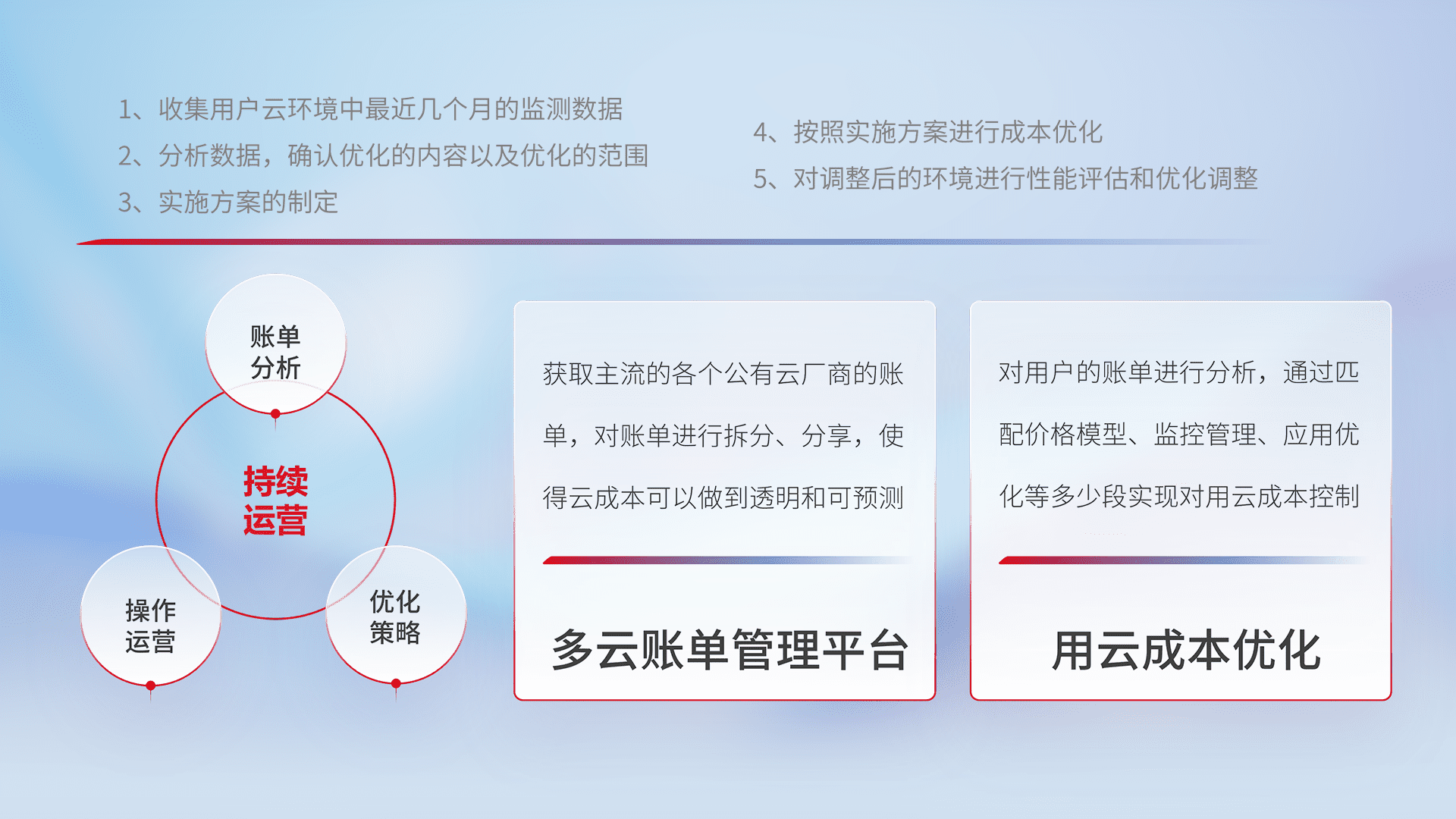 通过多云纳管,,以统一的资源数据模型把客户的云资源进行抽象和封装,,,,进而实现对多云资源的统一操作,,,保障云资源管理的可靠性、、稳定性与可用性。。量身定制化运维内容,,配置、、、开发运维、、补丁管理、、备份、、、、监控、、、、认证和访问管理、、、、审计和日常巡检等,,,保障在用云过程中的可靠度,,,稳定度以及高可用率。。。。